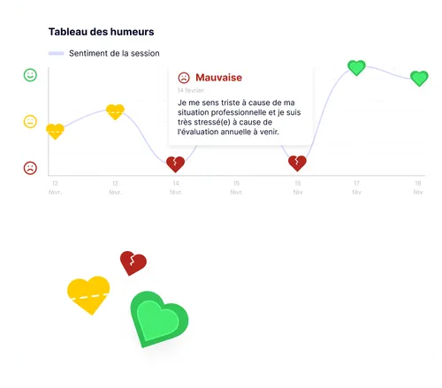 Vos conversations sont anonymes et chiffrées. Nous ne conservons que quelques mots-clés pour générer votre rapport d'humeur. Vous pouvez demander la suppression de vos données à tout moment.